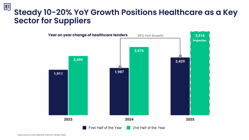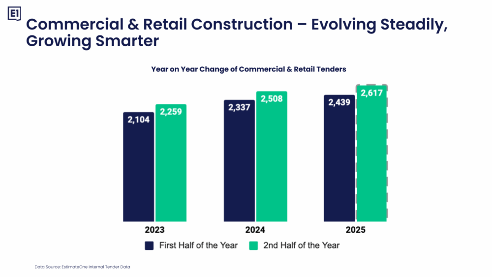 On the E1 platform, tender activity held steady over the past year — a low single-digit change overall — but that stability hides sharp differences between sectors. Education and healthcare are booming with double-digit tender growth, industrial projects are charging ahead (especially logistics and data centres), while retail and private commercial builds have slowed or pivoted toward upgrades.