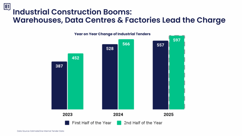 Industrial construction (encompassing logistics facilities, warehouses, factories, and data centres) has shown robust growth as a segment of commercial construction. In the past year, E1 (EstimateOne) data indicates industrial project tenders increased markedly (potentially 20%+ YOY, simulated), though with some quarter-to-quarter volatility. Several factors are driving this strength: